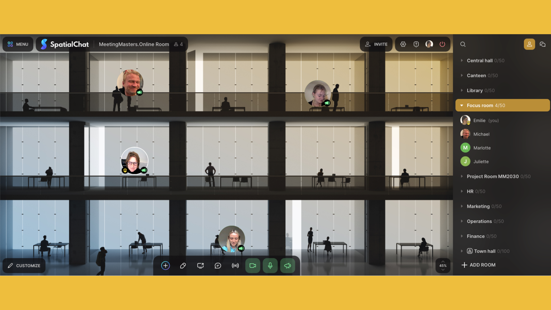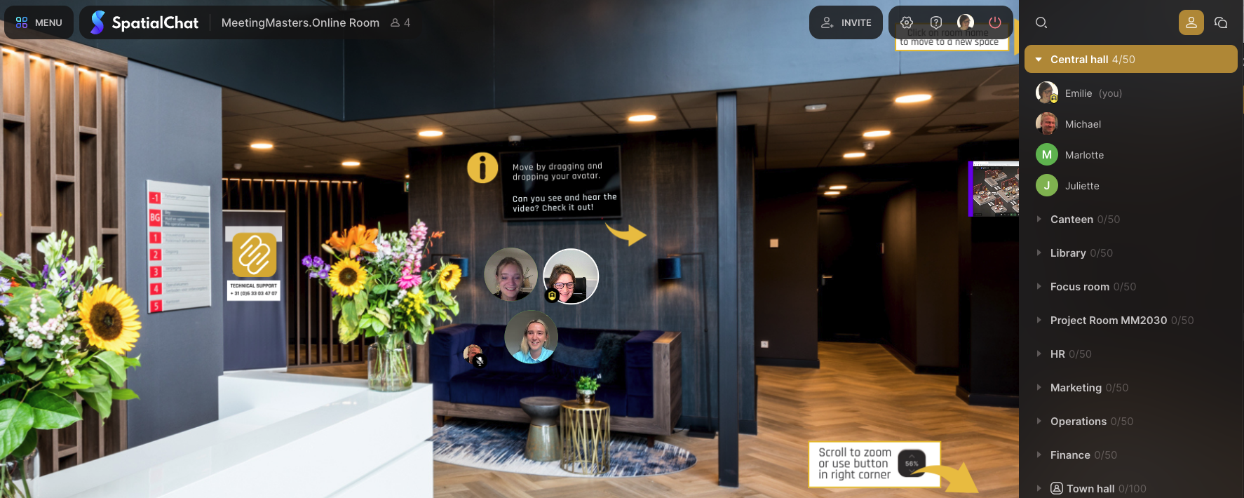 We need a place where hybrid organizations can flourish. Where co-workers can have daily routines, intermezzos, and meetings, aside from all the planned calls and business gatherings. SpatialChat is a platform for meeting and engagement in its broadest sense and it fully supports our vision of that ‘in-between’ space. To have an equal presence, regardless of location. To be connected when you are not in a meeting.