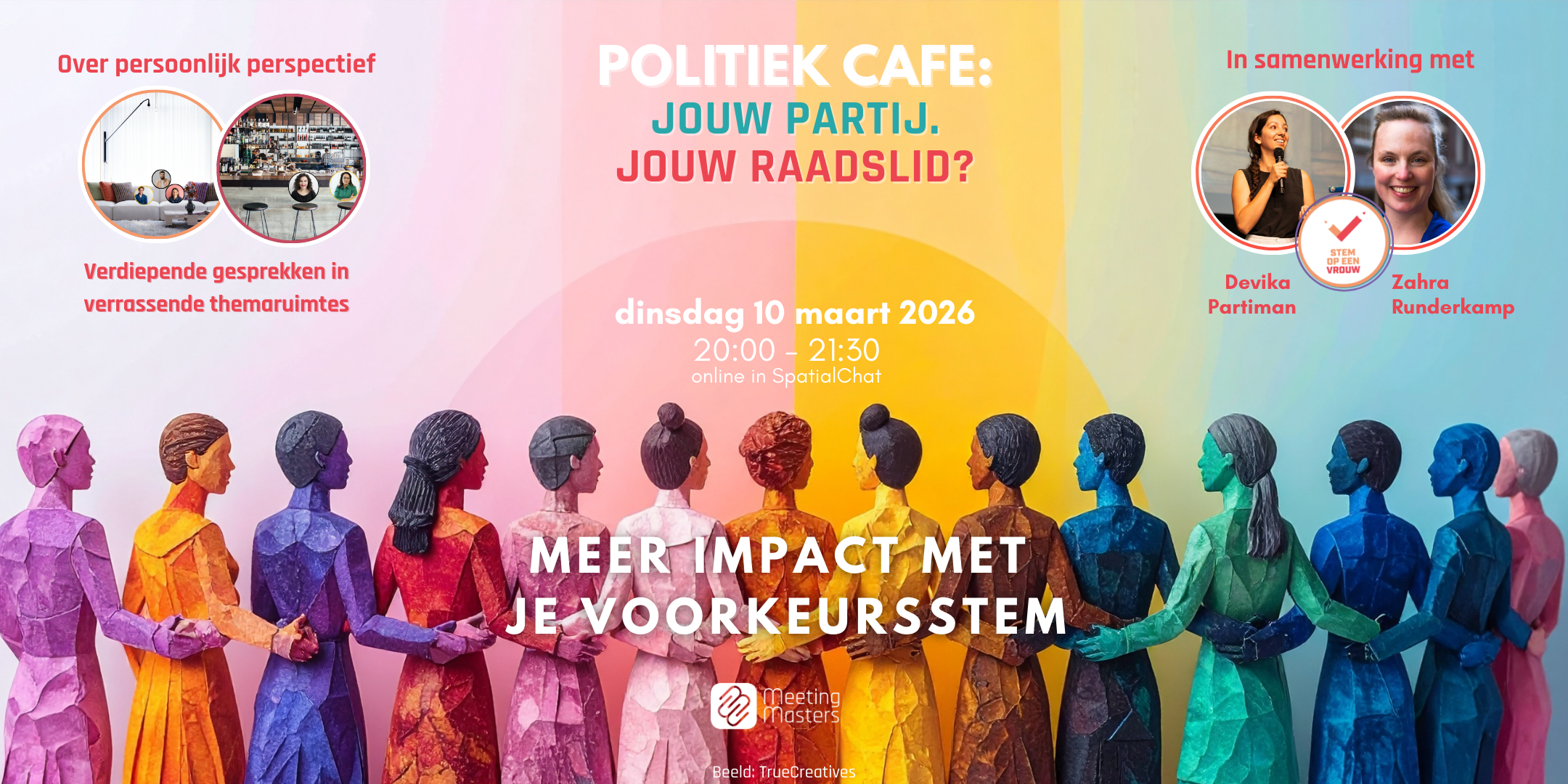 Zoals je van ons gewend bent, doen we dat kort plenair, met onder meer Devika Partiman en Zahra Runderkamp van Stem op een Vrouw. Daarna maken we het interactief, in kleinere gesprekssessies waarin ruimte is voor reflectie en concrete actie. Het event vindt plaats in SpatialChat: een meeting platform met ongekende mogelijkheden om verrassende gesprekken te voeren waar ‘live’ bijna niet aan kan tippen.